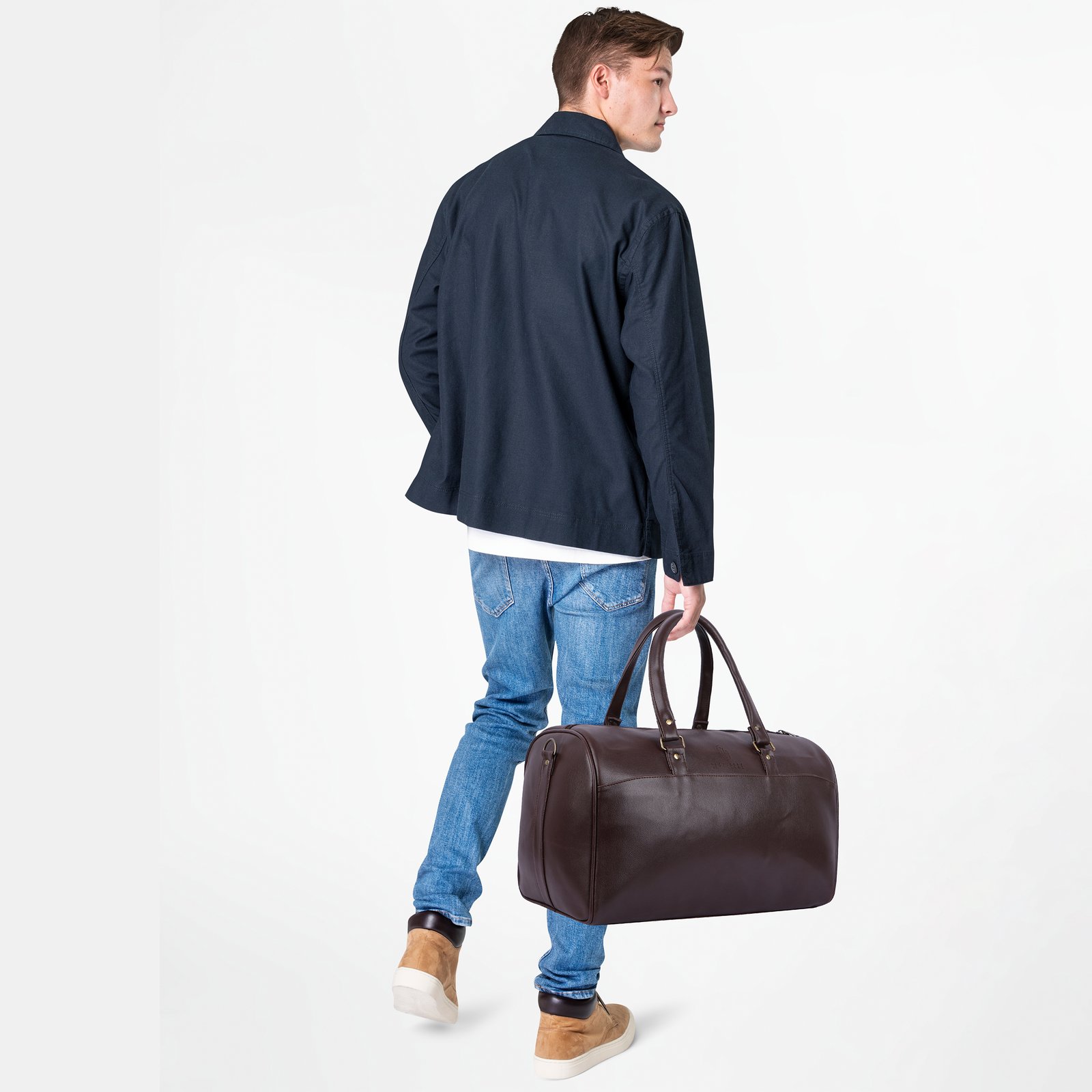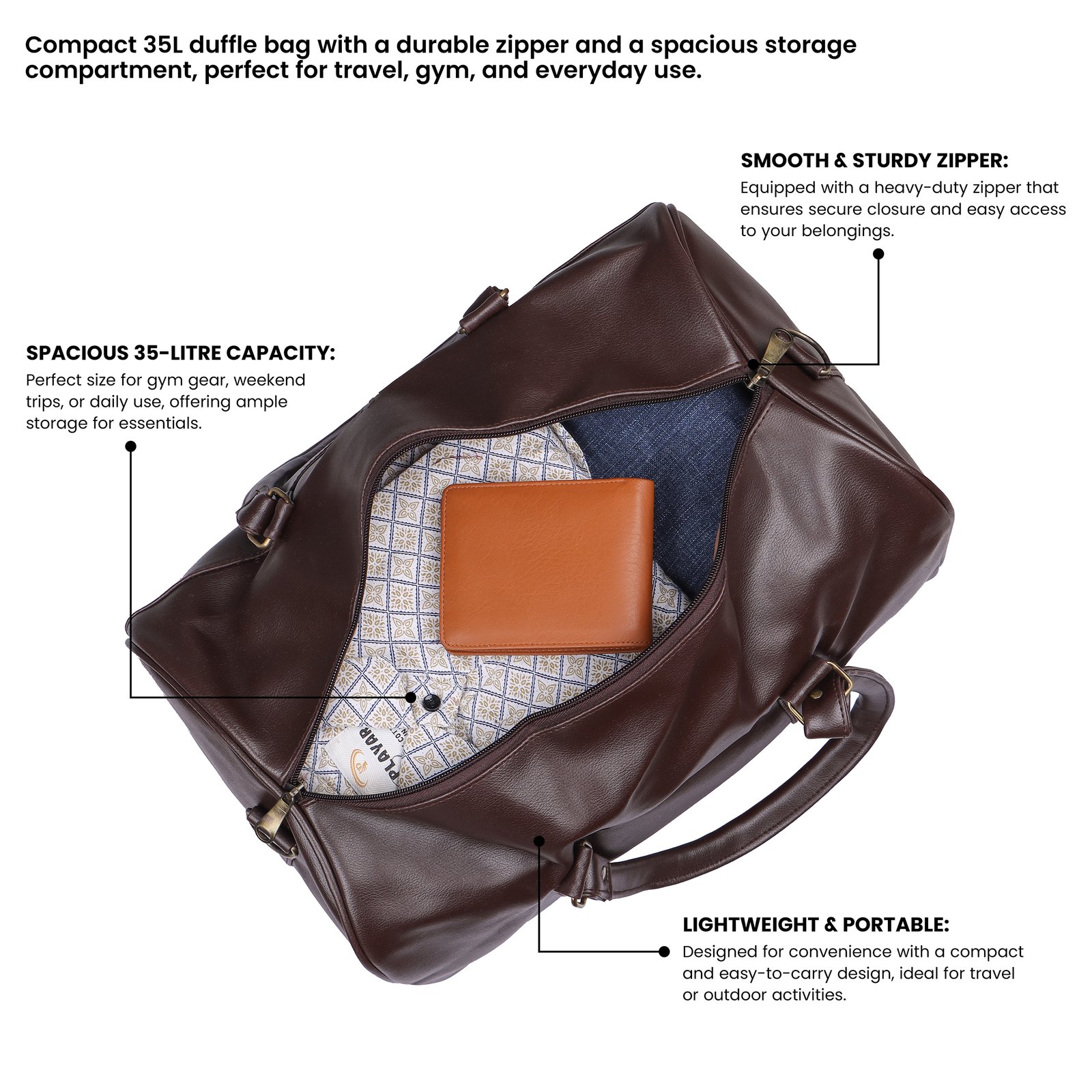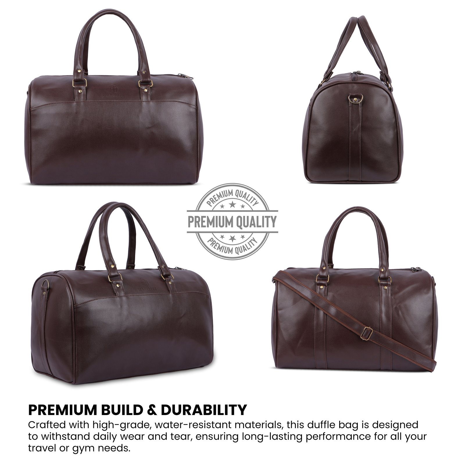 Elevate your travel style with this premium brown leather-finish duffle bag. Designed with a smooth, rich texture and a timeless rounded silhouette, it offers both elegance and durability. The spacious interior provides ample room for clothes, accessories, and travel essentials, while sturdy double handles ensure a comfortable grip. Ideal for weekend getaways, business trips, or gym use, this bag perfectly blends luxury, functionality, and long-lasting quality—making it a must-have companion for every traveler.