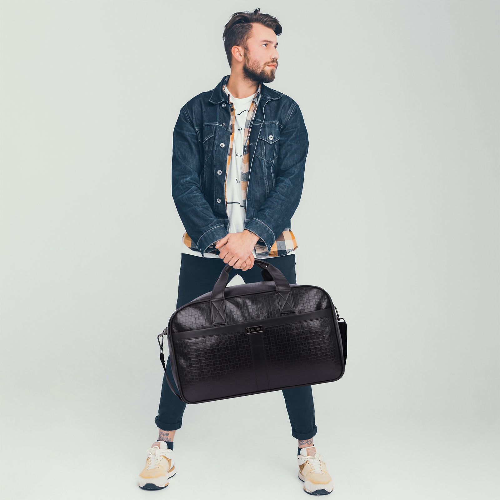 Carry your essentials in style with this premium black textured weekender bag. Designed with a sleek square-patterned finish, it offers a perfect blend of elegance and durability. The spacious main compartment, sturdy dual handles, and adjustable shoulder strap ensure maximum comfort during travel. Ideal for weekend getaways, gym sessions, or office trips, this bag delivers both functionality and refined aesthetics. Made with high-quality materials for long-lasting performance, it’s a must-have accessory for modern travelers.