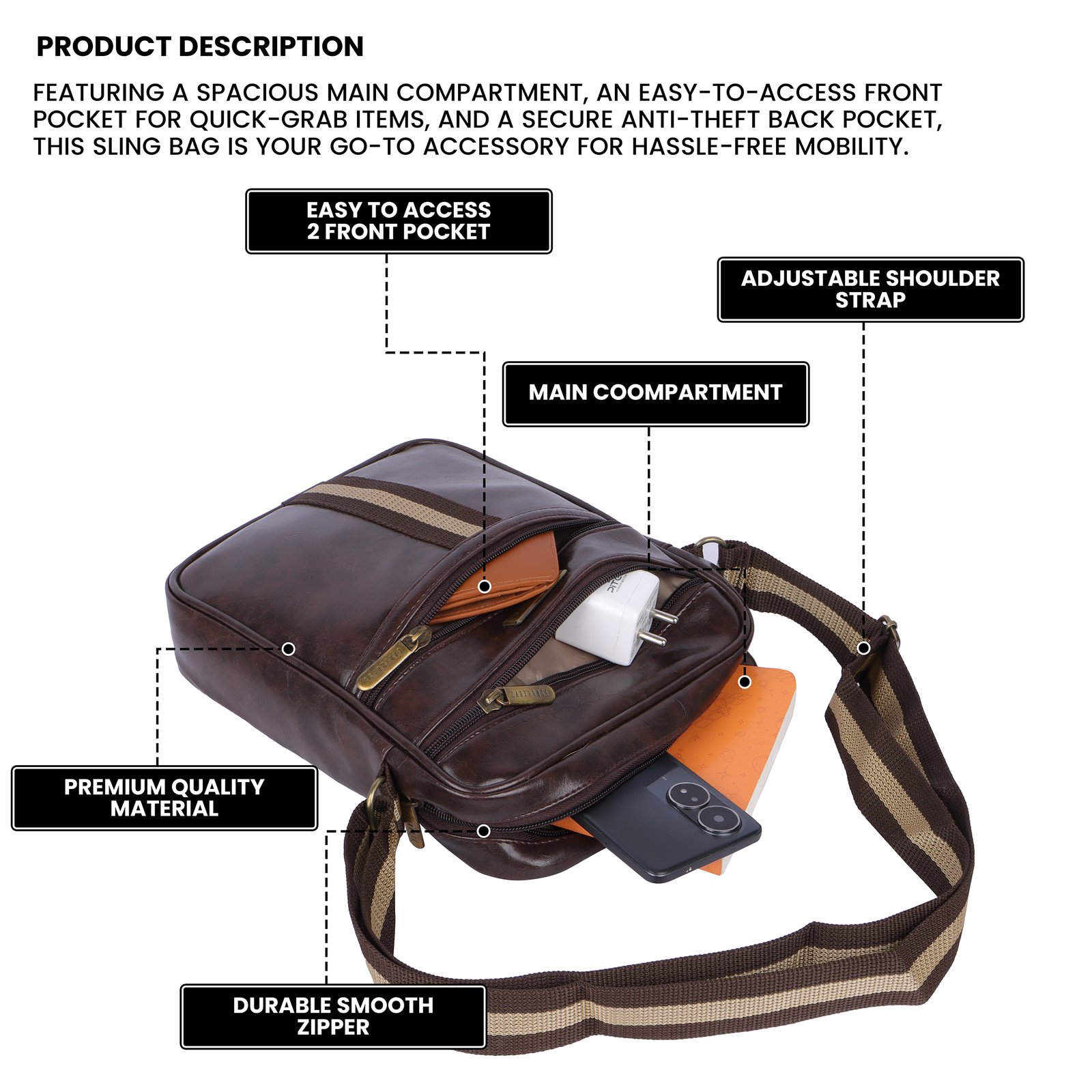 An adjustable shoulder strap ensures comfortable carrying, allowing you to wear it as a sling or crossbody. Built for practicality and style, this bag is perfect for those who appreciate quality craftsmanship and functional design.