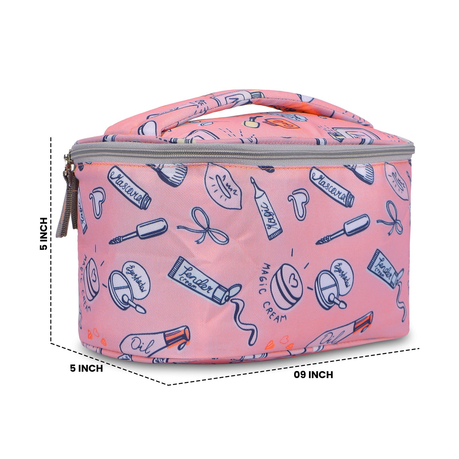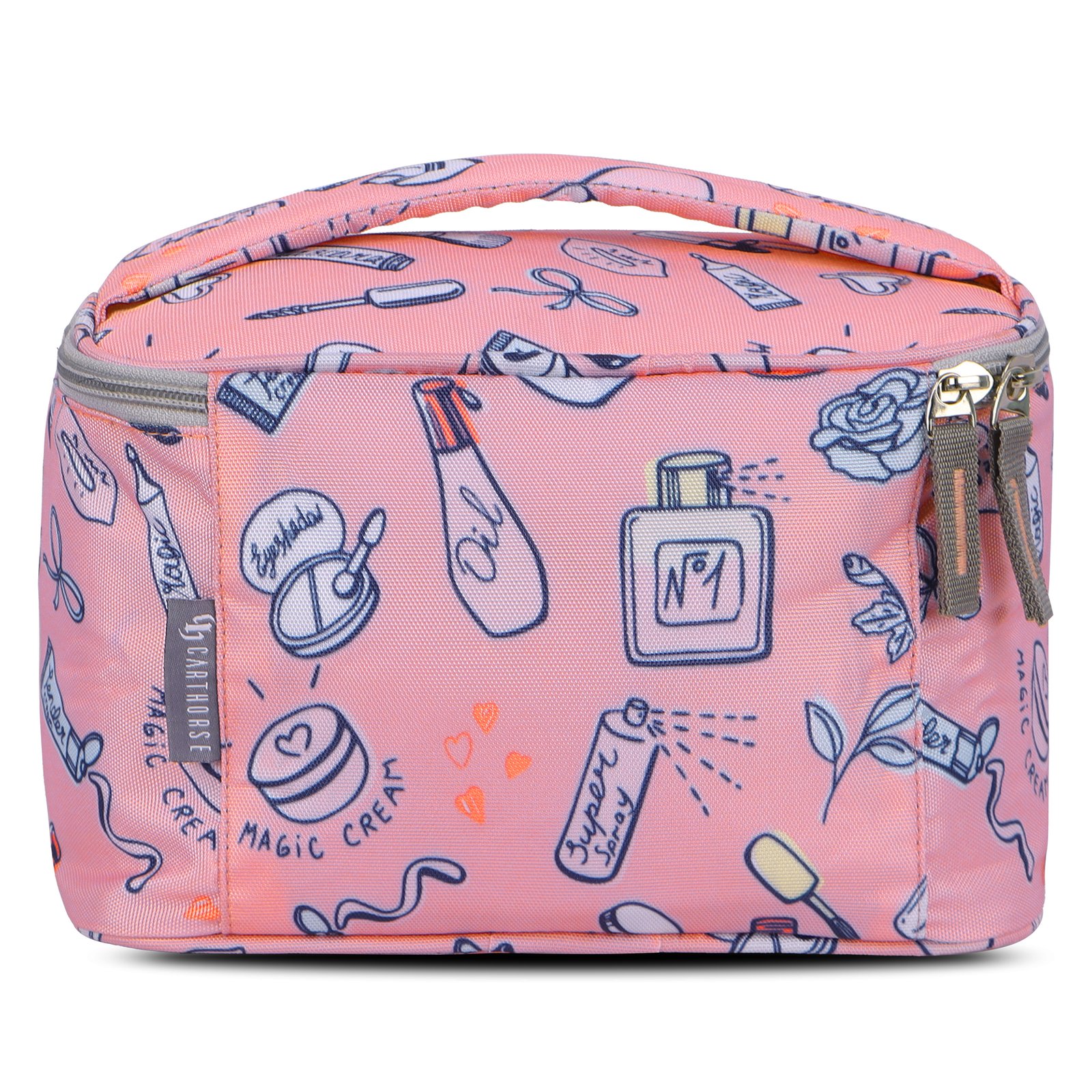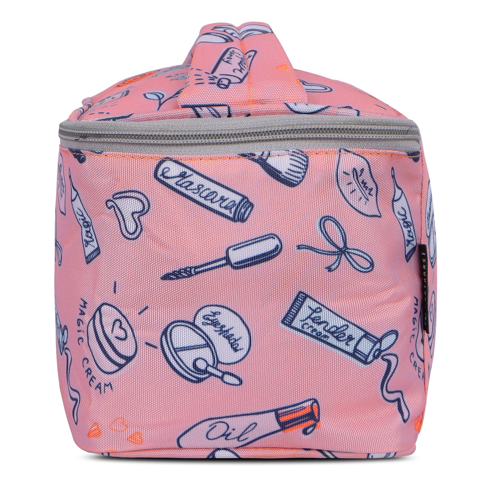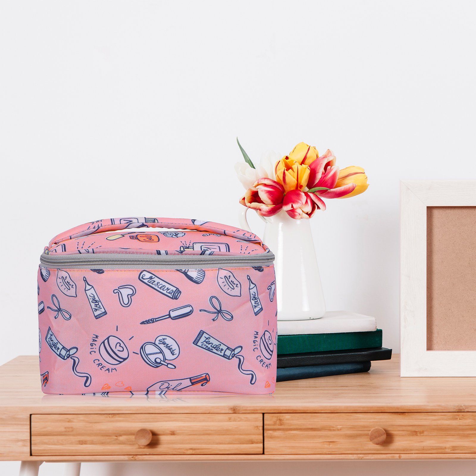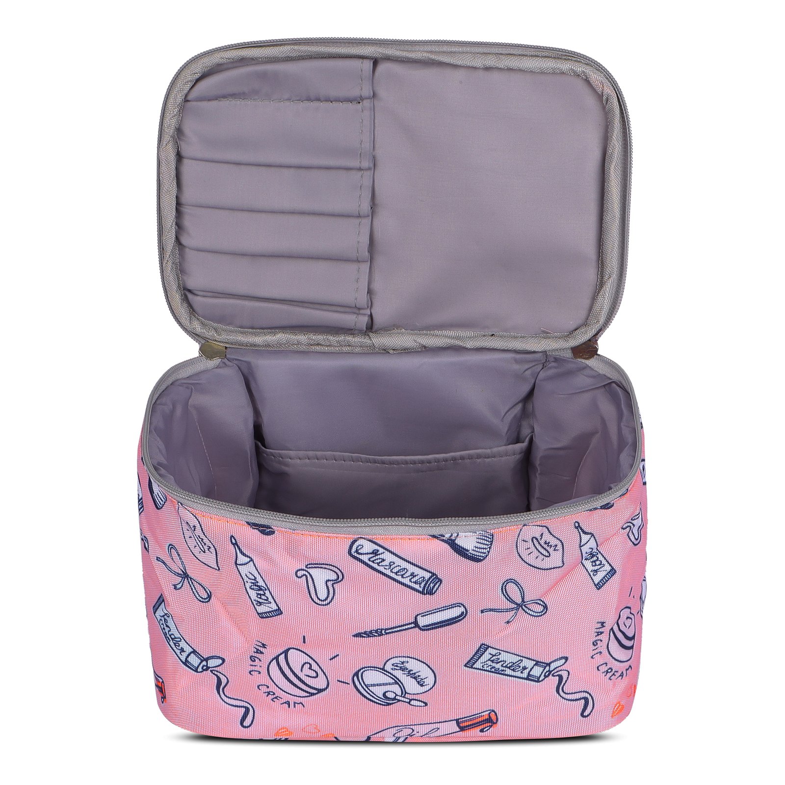 Keep your beauty essentials stylishly organized with this adorable pink cosmetic bag featuring fun doodle prints. Designed with a wide, spacious compartment and soft inner lining, it easily holds makeup, skincare, brushes, and travel accessories. The top flap includes dedicated slots for brushes and tools, while the sturdy zipper closure ensures everything stays secure. Lightweight, durable, and perfect for travel or daily use, this vanity bag brings both cuteness and convenience to your routine.