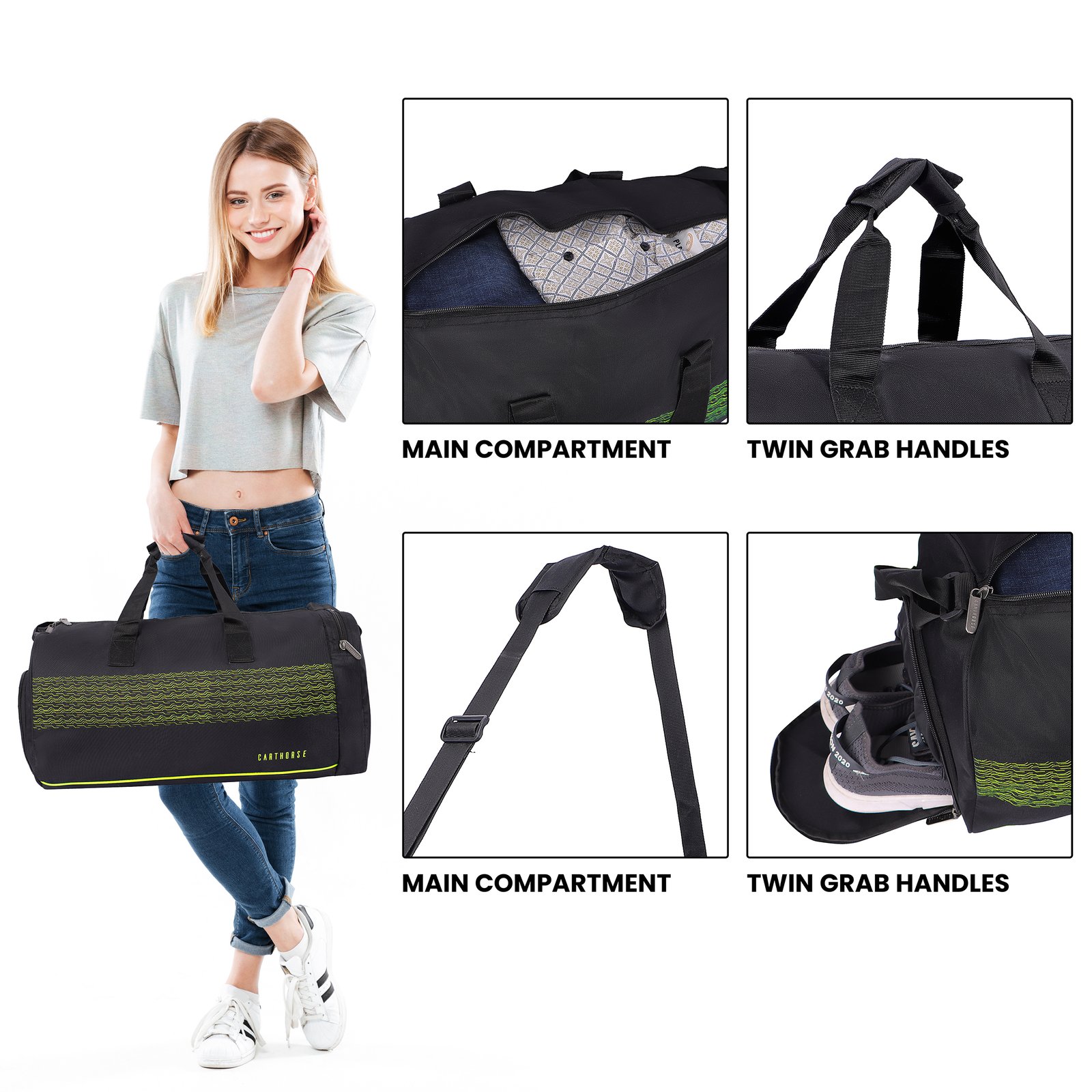 The spacious main compartment easily fits clothes, towels, and essentials, while the separate shoe compartment keeps footwear isolated from clean items. A side zip pocket provides quick access to smaller belongings such as keys, wallet, or accessories. Strong carry handles and smooth, durable zippers ensure comfort and long-lasting performance.